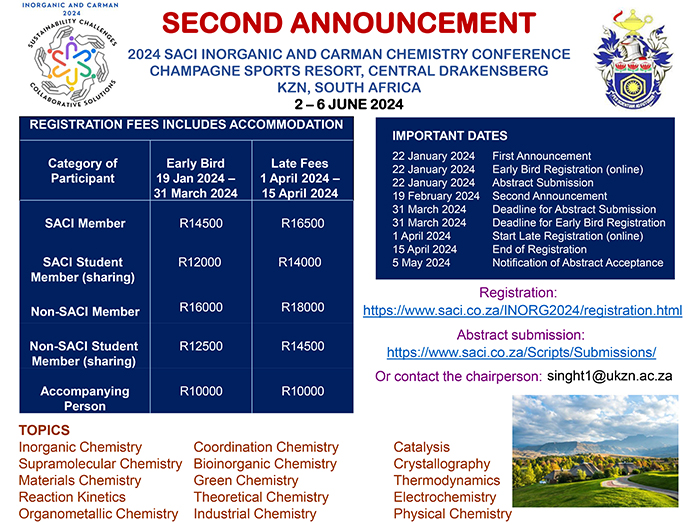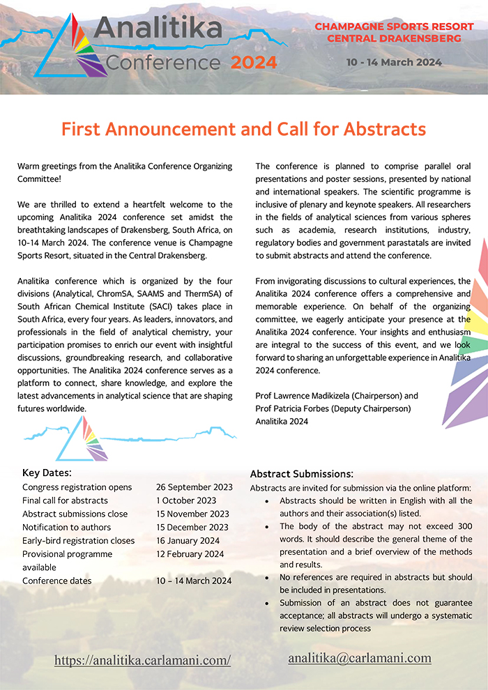 ChromSA short course | Improving GC-MS analyses - Dr Steve LancasterWe are pleased to announce that ChromSA has organised a one-day short course: Improving Gas Chromatography-Mass Spectrometry Analyses presented by Dr Steve Lancaster, Head of Analytical Sciences, Domino Printing Services, UK Date: 8 March 2024 Venue: South African Grain Laboratories (SAGL), Pretoria Closing date for registration: 12 February 2024 The short-course brochure and registration form Please send proof of payment and completed registration form to: belinda-leigh.hickman@necsa.co.za.
