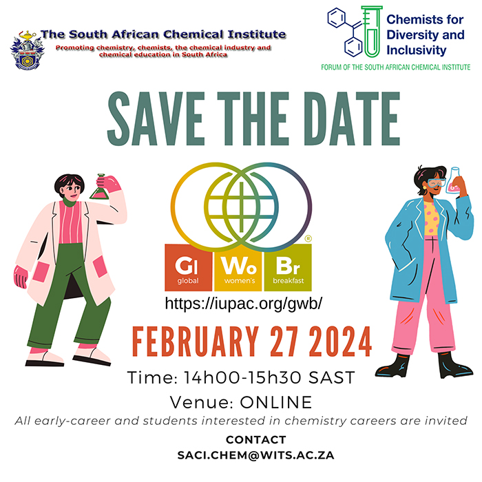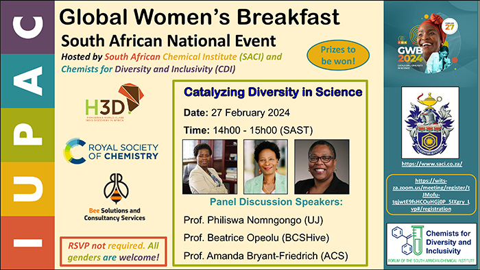 I am excited to inform you that the inaugural ElectrochemSA Masterclass Series 1 is on the 11th of April, 2024. EMS 1 will be in conjunction with 2nd Senergylab Workshop on Recent Advances in Sensors and Energy Driven Applications at the University of the Western Cape. Please visit The ElectrochemSA Website - ElectrochemSA (saci.co.za) - and register to attend the inaugural EMS and the 2nd Senergylab Workshop. You are welcome both physically and online. Since EMS will be online, I encourage all researchers to attend and encourage their MSc, PhDs and Postdoc to join. Looking forward to seeing you all online or in capetown. IUPAC Global Womans's Breakfast 27 February 2024