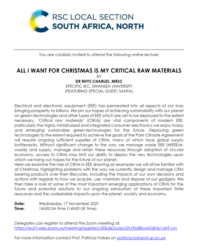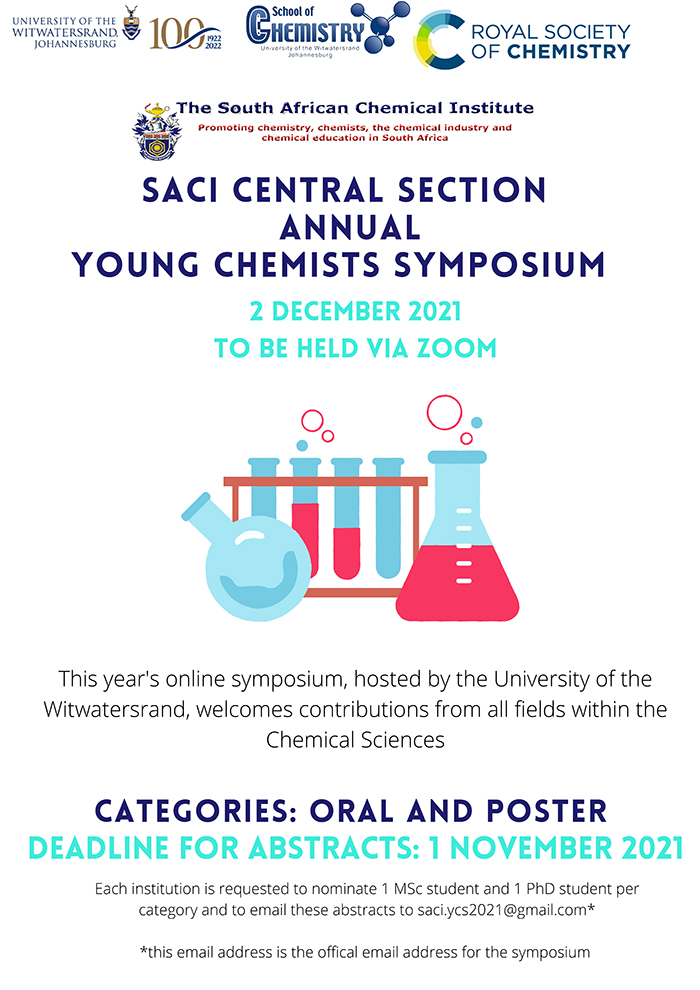 We hope that all our members are well and safe, and are pleased that the pandemic has slowed down in the country. In this newsletter we have news of our AGM and Council meetings, and from our KZN and Western Cape Sections. Our new SACI President, Professor Willem van Otterlo, was inaugurated at the SACI AGM in August and the various SACI Awards were also announced there. Congratulations to all the awardees for this wonderful achievement! Keep up the good work and the face of chemistry in our country. We are also grateful to all those who are voluntarily serving on various SACI committees. Without your assistance there would not be any SACI.