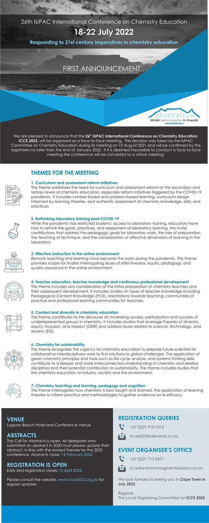 26th IUPAC International Conference on Chemistry Education (ICCE), 18-22 July 2022, Cape Town, South Africa - Registration and abstract submissions are open